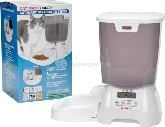 De Catmate voederautomaat is een automatisch droogvoer apparaat voor katten en kleine honden. Gemakkelijk in gebruik. Het heeft een maximale voedselvoorraad van 3 kg, wat voor een kat komt op ongeveer 1 maand voedsel. Het unieke mechanisme zorgt voor een gelijke hoeveelheid voedsel vanaf 10 gram. Maximaal 3 maaltijden per 24 uur.