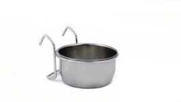 Een metalen eet of drinkbakje voor knagers, vogels en andere kleine dieren. Voorzien van ophanghaken. Kan ook gewoon worden neergezet, je hoeft alleen maar de ring te verwijderen. Doorsnede: 9cm.