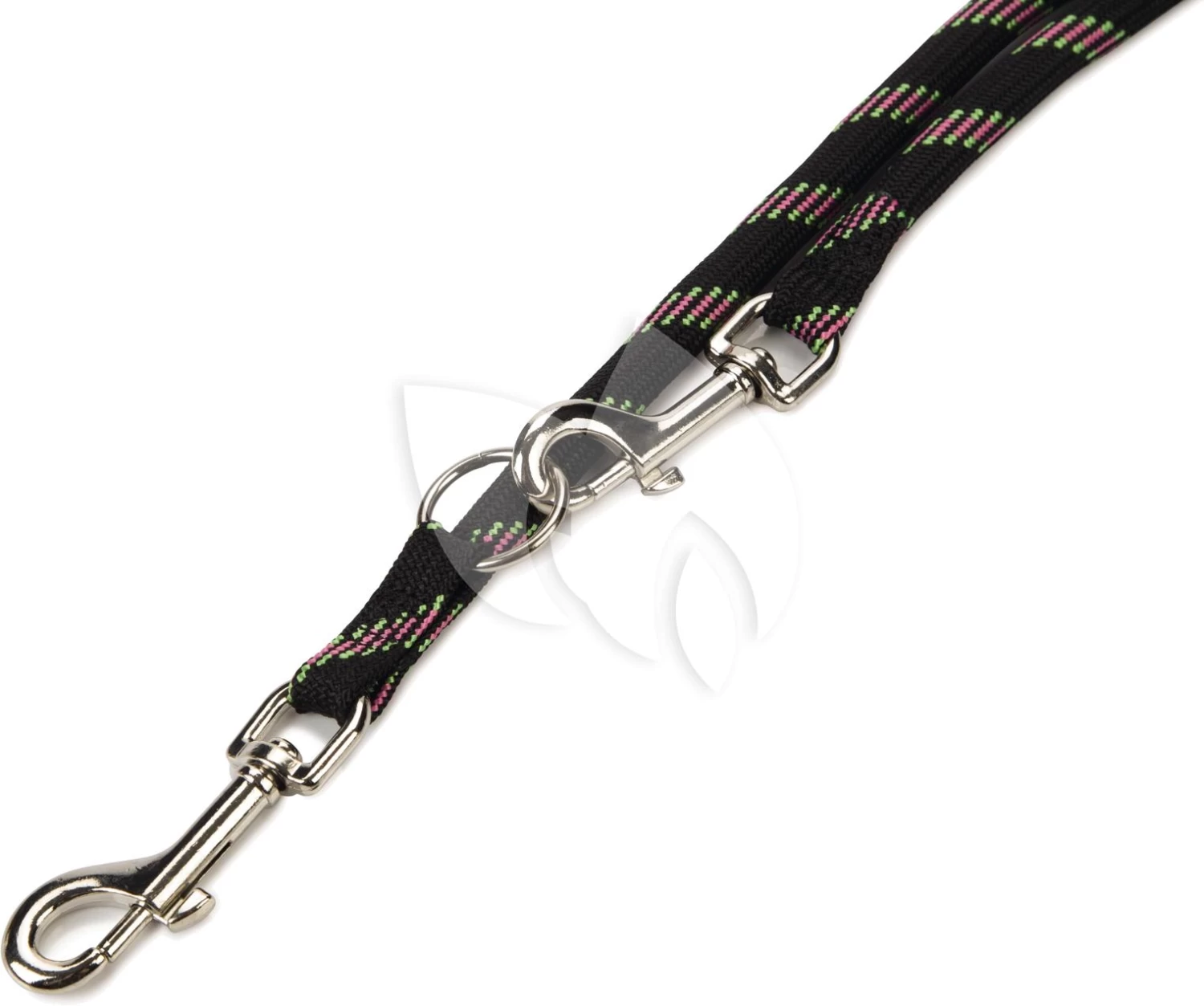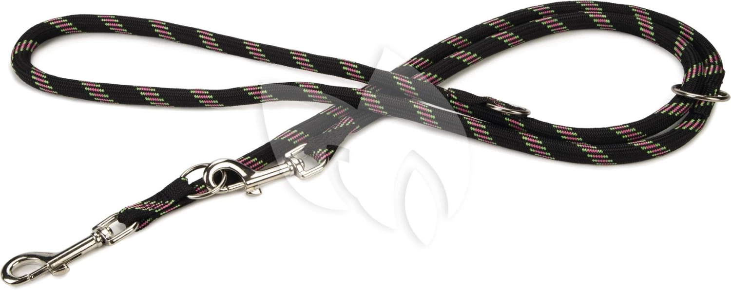 Ronde verstelbare nylon looplijn. Zet de musketonhaak vast aan een van de ringen voor de gewenste lengte van de lijn. Het handvat heeft een fijn comfort en stevige grip door de ronde vorm. Kleur: zwart.