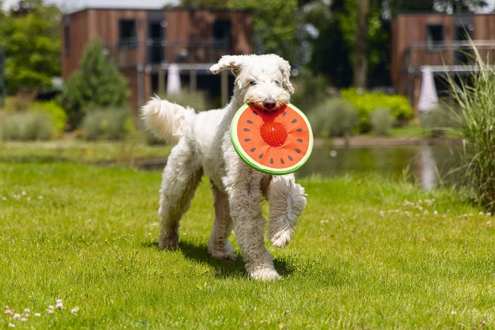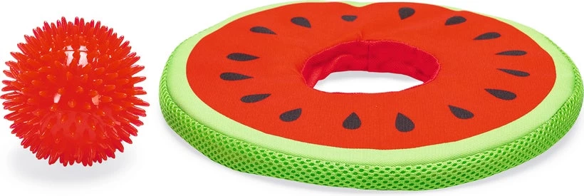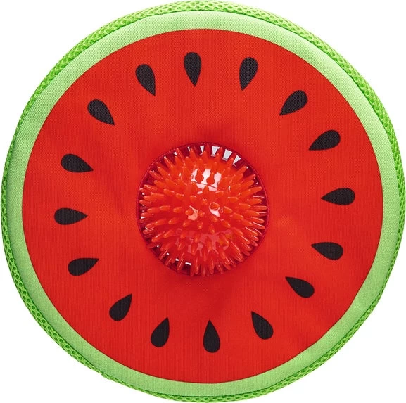 De meloen is rond en plat, waardoor je deze weg kan werpen zoals je met een frisbee doet. Voor jouw hond heeft dit speeltje een extra verrassingseffect, namelijk een stevige TPR stekelbal in het midden. De bal zal al spelenderwijs de tanden van jouw hond masseren, wat bijdraagt aan een goede doorbloeding.