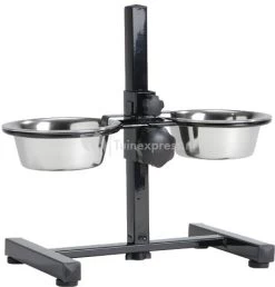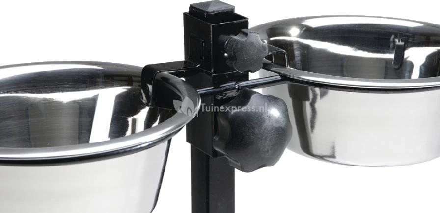 Hondenstandaard voor pups of kleine honden inclusief 2 RVS bakken. De standaard is in hoogte verstelbaar en aan de onderzijde voorzien van rubberen doppen tegen bescherming van uw vloer. Doorsnede van de RVS bakken zijn 13 en 16 cm. Kleur: zwart.