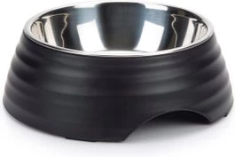 De hondenvoerbak Rimpu van Beeztees heeft een moderne uitstraling en past dankzij de neutrale zwarte kleur binnen ieder interieur. De ribbels die rondom lopen, geven de voerbak een speels effect. De binnenkant van de melamine voerbak bestaat uit een RVS bakje die vaatwasserbestendig is.
