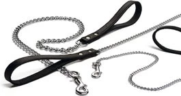 Een kettinglijn voor de hond met schakels, voorzien van een zwart lederen handvat. De ketting heeft een dikte van 4 mm en een lengte van 120 cm. Het handvat heeft een breedte van 18 mm.
