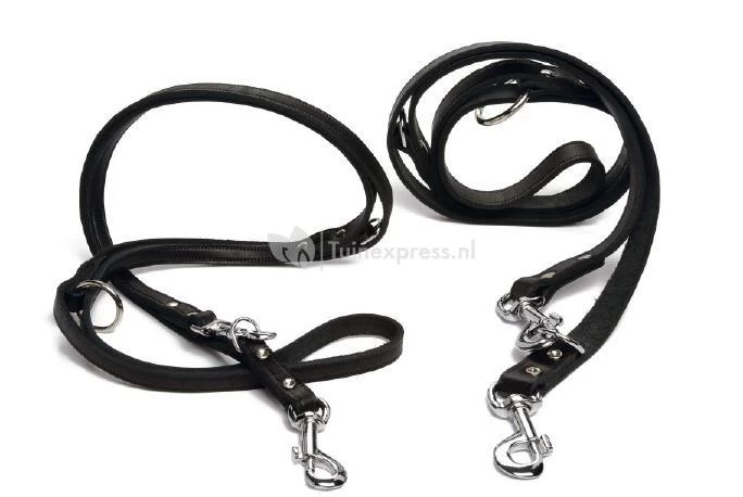 Een lederen dressuurlijn waarmee u uw hond kunt trainen, doordat deze riem verstelbaar is in verschillende maten. Zo kunt u de hond kort houden, alsmede wat meer vrijheid geven.