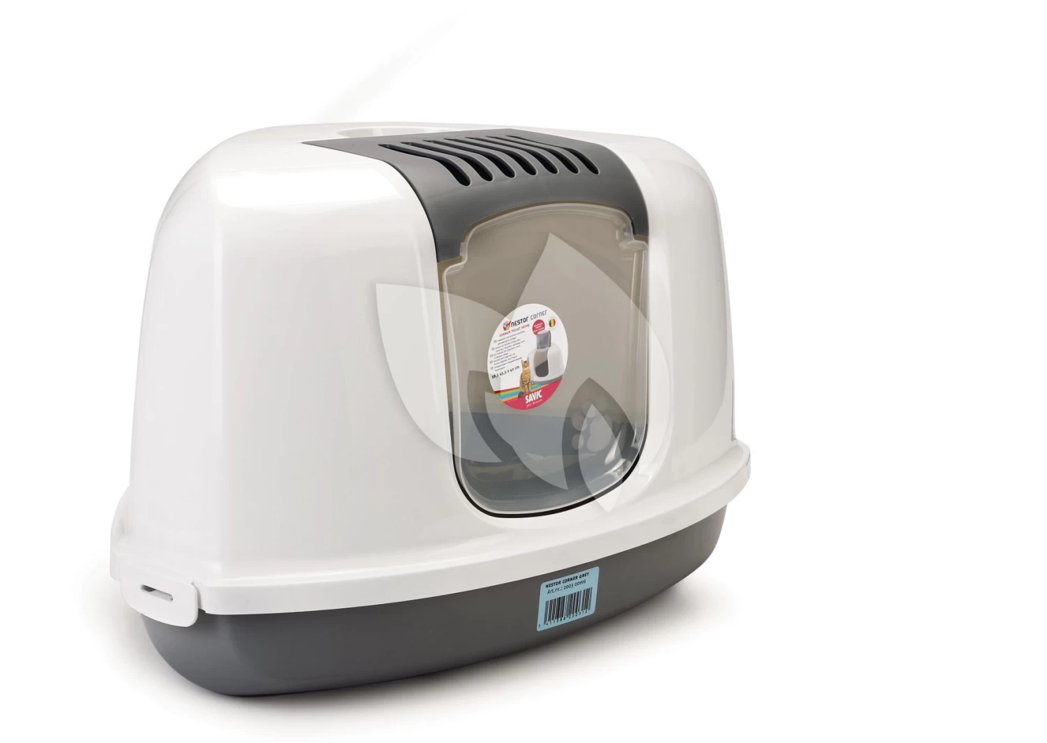 Kattenbak Nestor corner. Doordat het deurtje samen met het binnenste gedeelte van de bovenzijde los te klikken is, hoeft u voortaan niet de gehele bovenkap los te klikken om de kattenbak schoon te maken. Deze corner kattenbak is door zijn vorm makkelijk in een hoek te plaatsen. Kleur: grijs, wit. Afmeting: 58 x 45 x 40 cm.