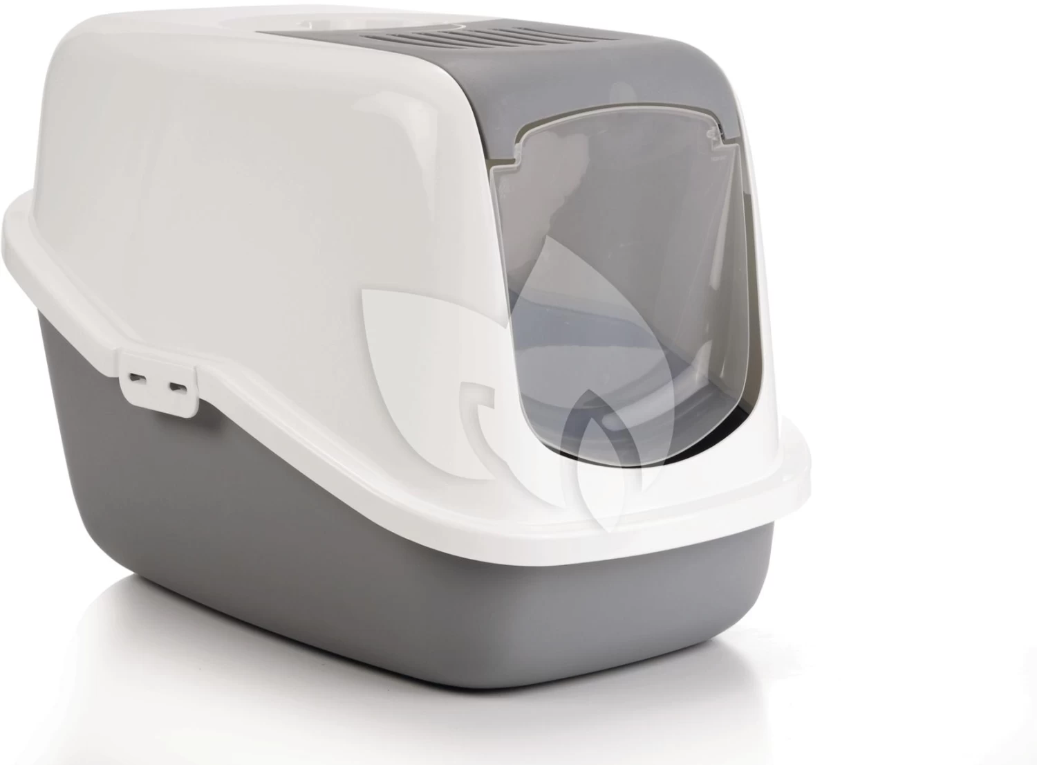 Een mooigevormde kattenbak in een modieuze kleurstelling. Doordat het deurtje samen met het binnenste gedeelte van de bovenzijde in een handomdraai los te klikken is hoeft u niet meer de complete bovenzijde van de onderbak los te maken om deze schoon te maken. Het los geklikte gedeelte kunt u omhoog duwen zodat u er makkelijk bij kunt. Kleur onderbak: glanzend grijs, kleur bovenzijde: glanzend wit met een grijs middenstuk.