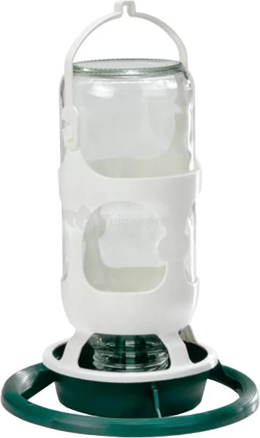 Een pothouder Omnia met glazen pot voor voer of water. Eenvoudig te vullen. De fles kunt u ophangen of gewoon neerzetten. Voor bijvoorbeeld in volieres. De gaatjes in het onderste gedeelte kunt u gebruiken om een verwarmer in te steken, zodat het water niet bevriest .
