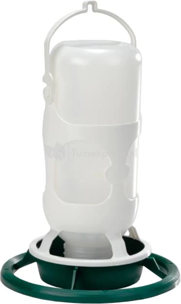 Een pothouder Omnia met plastic pot voor voer of water. Eenvoudig te vullen. De fles kunt u ophangen of gewoon neerzetten. Voor bijvoorbeeld in volieres.