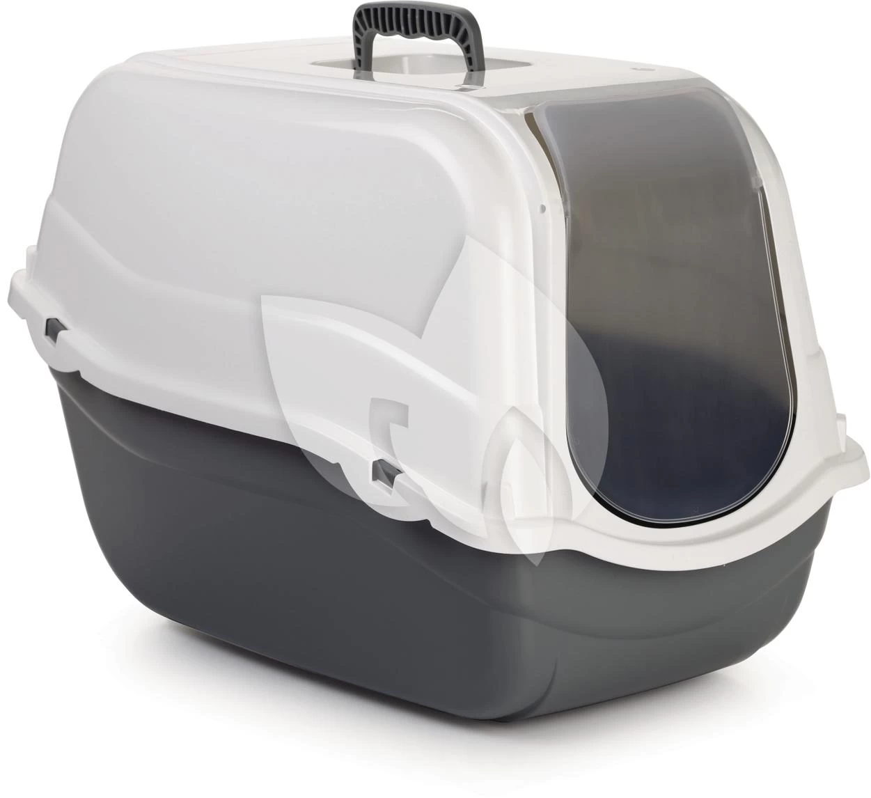 Een eenvoudig kattentoilet, genaamd Romeo, zonder filter maar met deurtje. Kleur onderbak: grijs, kleur bovenkap: wit. Afmeting: 54 x 33 x 42 cm.